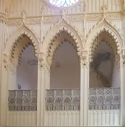 The main nave, compared to the two smaller ones, in addition to the sixth bay (which, compared to the previous ones, is shallower as it corresponds to the ancient apse of the thirteenth-century church) has another one, formerly used as a presbytery, whose floor is placed at a higher level than the hall and is connected to it by a series of steps. The room, covered with a cross vault decorated with the coats of arms of the royal family, is lit not by two single-lancet windows, but by two rose windows, below which open, with three pointed arches, two women's galleries: the one on the left, with independent access from the outside, was used as a royal box, while the one on the right (destroyed by a bomb during World War II, on September 8, 1943, and later rebuilt without, however, restoring its decorations) as a chancel.[42]