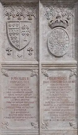 In the lower part, while each of the two lateral naves has a slender ogival single lancet window with wimperg, the central nave has a portal, also in travertine, with a deep spandrel richly decorated in bas-relief with floral motifs.[34] It is surmounted by a high wimperg decorated with a high relief by Salvatore Irdi depicting the allegory of the Restoration of the Papacy and surmounted by a statue by Gennaro Calì depicting St. Francis of Assisi. On either side of the door, under a canopy, are marble statues of Charles II of Anjou (left) and Ferdinand II of the Two Sicilies, both by Gennaro De Crescenzo. Each of them rests on a high polygonal base with an inscription in Latin recalling the ruler's commitment to the Gaetan Church:[35]