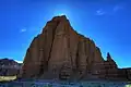 Temple of the Moon is composed of unfractured, buff-pink Entrada Sandstone.[4] The sandstone, which was originally deposited as sandy mud on a tidal flat, is believed to have formed about 160 million years ago during the Jurassic period as a giant sand sea, the largest in Earth's history.[6] Stratum in Cathedral Valley have a gentle inclination of three to five degrees to the east, and appear nearly horizontal. Long after these sedimentary rocks were deposited, the Colorado Plateau was uplifted relatively evenly, keeping the layers roughly horizontal, but Capitol Reef is an exception because of the Waterpocket Fold, a classic monocline, which formed between 50 and 70 million years ago during the Laramide Orogeny.[7]