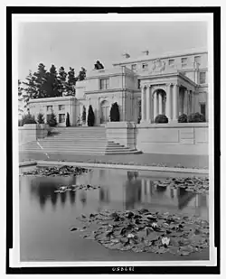 Outdoor scenes for the motion picture Gimme were filmed by Rupert Hughes at Uplands II in 1922;[20] the salaries of the society women who served as extras and the rental fee for the grounds were donated to charity.[21] Irwin and Crocker announced their intention to divorce in 1927, with Irwin alleging cruelty, long absences from home, and neglect;[22] the divorce was finalized in 1928[23] and Crocker decamped to his new San Francisco apartment, selling the mansion in 1942 to Romie C. Jacks, the son of David Jacks, who popularized Monterey Jack cheese.[24][25] Uplands II was temporarily rented in 1951 to a Soviet delegation, including Deputy Foreign Secretary Andrei Gromyko, who were attending the Japanese Peace Conference that year.[26] Jennie Crocker repurchased Uplands II in 1956 for US$95,000 (equivalent to $1,100,000 in 2024) and assisted the Trustees of Crystal Springs School in acquiring it for Crystal Springs Uplands School, where it serves as the main building for the private high school.[25] The mansion is one of three prominent examples of Beaux-Arts architecture in Hillsborough, along with Carolands and La Dolphine.[19]: 15–18