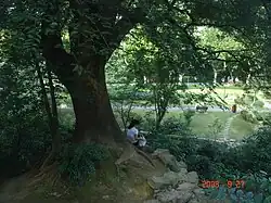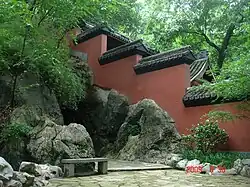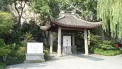 In his version, Kangxi renamed the view at Quyuan from "Breeze of Lotus" to "Breeze-ruffled Lotus" to highlight the lotus. It was widely believed that the emperor mistakenly wrote the name of Quyuan, which originally refers to the former royal brewery (麯院), as the winding courtyard (曲院). The two phrases had the same pronunciation but distinct meanings. As a result, the Qianlong emperor wrote a poem on the back of Kangxi's inscription, claiming that there was no mistake as Kangxi, his grandfather, hoped to abstain from drinking like a saint.[7] Therefore, Quyuan is often translated as the Crooked Courtyard,[8] the Winding Garden,[9] or the Brewing Courtyard.[10]
