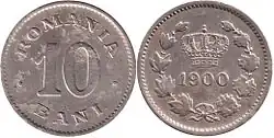 A second ten-bani coin was struck only in 1900, in Brussels, Belgium. It measured 19mm in diameter and weighed 3.5g. It was made of 75% copper and 25% nickel. Its obverse featured the crown of Romania above the date within a wreath of a laurel branch and oak branch. The reverse featured the denomination and name of the country. A total of 15 million were issued.[2]