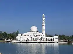 The Tengku Tengah Zaharah Mosque or the Floating Mosque is the first real floating mosque in Malaysia. It is situated in Kuala Ibai Lagoon near the estuary of Kuala Ibai River, 4 km from Kuala Terengganu Town. Construction began in 1993 and finished in 1995. The mosque was officially opened in July 1995 by Sultan Mahmud Al-Muktafi Billah Shah, the late Sultan of Terengganu. The mosque combines modern and Moorish architecture; incorporating the use of marble, ceramics, mosaic works and bomanite paving. The white structure of the mosque covers an area of roughly 5 acres and can accommodate up to 2,000 worshippers at a time.[1]