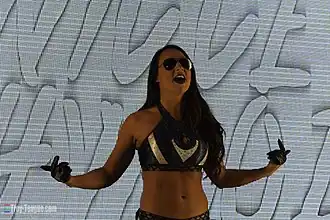 On 3 February episode of Raw, Emma was invited into the ring by Santino Marella to participate in a dance-off against Rae, which Emma won by a fan vote.[62] In the following weeks, the feud between Emma and Rae continued, and Emma eventually began teasing an on-screen relationship with Marella.[63][64][65] Emma and Rae faced off in a match on 24 February episode of Raw, in which Emma was victorious.[66] This led to mixed tag team match against Rae and Fandango on 3 March episode of Raw, which Emma and Marella won.[66] On 25 March episode of Main Event, Emma teamed up with Natalya, The Funkadactyls (Cameron and Naomi) and Eva Marie in a losing effort to the team of Rae, Alicia Fox, Aksana, Layla and Tamina Snuka.[67] On 27 March episode of Superstars, Emma once again defeated Rae by submission.[66] On 6 April, Emma made her WrestleMania debut, competing at WrestleMania XXX in the 14-Diva "Vickie Guerrero Invitational match" for the Divas Championship, which was won by the defending champion AJ Lee.[68] The following night on Raw, Emma and Marella once again defeated Rae and Fandango in a mixed tag team match, with Emma making Rae submit.[69] On the following episode of SmackDown, Emma started a feud with Layla, when she replaced Summer Rae as Fandango's dance partner and valet.[70][71] This led to Emma using Marella's finisher, the Cobra Strike, later dubbing it the Ven-Emma, to defeat Layla on 21 April episode of Raw.[72] In the beginning of July, Emma's alliance with Marella ended after he announced his legitimate retirement from in-ring competition.[73]