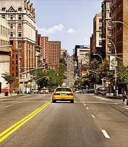 Tenth Avenue, known as Amsterdam Avenue between 59th Street and 193rd Street, is a north-south thoroughfare on the West Side of Manhattan in New York City. It carries uptown (northbound) traffic as far as West 110th Street (also known as Cathedral Parkway), after which it continues as a two-way street.