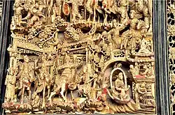 Teochew woodcarving, or Chaozhou woodcarving (Chinese: 潮州木雕; pinyin: Cháozhōumùdiāo), is a form of Chinese wood carving originating from the Tang dynasty. It is very popular in Chaoshan, a region in the east of Guangdong. The Teochew people used a great deal of Teochew wood carving in their splendid buildings.