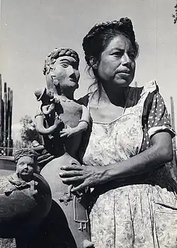 She also created allegorical figures with elements of fantasy,[5] influenced by the Atzompa tradition of creating small animal figures with human qualities, such as playing musical instruments.[2][3][6] Her fantasy figures include humans with animal heads or horns and women nursing animals. This work reflects traditional beliefs, especially in nahuals which in her region have both a positive and negative relationship with humans.[5] One such figure is a very large piece at the Casa de Cultura in Atzompa, a goddess of fertility figure, designated as such by eighteen breasts and the goddess’s many sons climb over her and an image of the moon is above the scene. Anthropomorphic figures and elements were almost always female, with exceptions such as archangels and king figures for nativity scenes.[2]