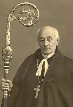 In 1929 the Faculty of Theology of the University of Latvia awarded Grīnbergs an honorary doctorate, and in 1932 he was elected as an external professor. In the same year he was elected Archbishop of the Evangelical Lutheran Church of Latvia, the first prelate with this title. His predecessor, Bishop Kārlis Irbe, was known as the bishop in charge of the Evangelical Lutheran Church of Latvia. However, due to an ongoing dispute concerning the ownership of the Rīga Dom. which prompted the resignation of his predecessor in 1932, Grīnbergs was not consecrated as Bishop, but rather inducted by his fellow pastors.[1] Archbishop Eidem of Uppsala wished Kārlis Irbe to take part in the consecration that was planned, but he refused. For this reason Archbishop Eidem never performed the consecration.[2] Grīnbergs retained the title of archbishop in 1944 when he went into exile. During his term in office, a new Hymn Book and a new edition of the New Testament were issued. In July 1938, an agreement for intercommunion with the Anglican Church of England was achieved . In the second half of 1944, the occupying German authorities exiled the archbishop, along with the leaders of other churches to Germany. Archbishop Grīnbergs continued to lead the church in exile until his death at Esslingen am Neckar in West Germany on 14 June 1962.[3]