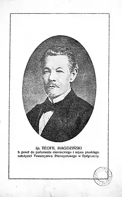 Teofil Magdziński (13 October 1818 – 1 February 1889) was a Polish lawyer, conspirator and activist in exile. He participated in several Polish uprisings of the second half of the 19th century. He was one of the most prominent politicians in Bydgoszcz,[1] representative at the Reichstag and a staunch defender of Polishness.