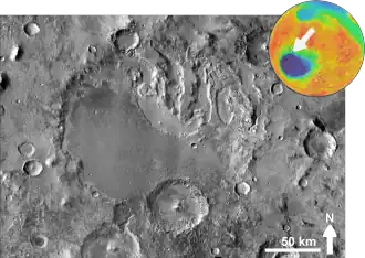 Terby is a crater on the northern edge of Hellas Planitia, Mars. It is in the Iapygia quadrangle. The 174-kilometre-diameter (108 mi) crater is centered at 28°S, 73°E with an elevation of −5 km (−3.1 mi). The crater is named after the Belgian astronomer François J. Terby. It is the site of an ancient lakebed and has clay deposits.[1] Using data from Mars Global Surveyor, Mars Odyssey, Mars Express, and Mars Reconnaissance Orbiter missions researchers believe Terby's layers were formed from sediments settling under water. Crater counts show this happened during the Noachian period. It used to be thought that Terby Crater contained a large delta.[2] However, newer observations have led researchers to think of the layered sequence as part of a group of layers that may have extended all the across Hellas. There is no valley large enough at the northern rim of Terby to have carried the large amount of sediments necessary to produce the layers. Other details in the layers argue against Terby's containing a delta.[3] Fan deposits are some of the thickest on Mars. Hydrated minerals, including iron/magnesium phyllosilicates, have been detected in several layers.[4]