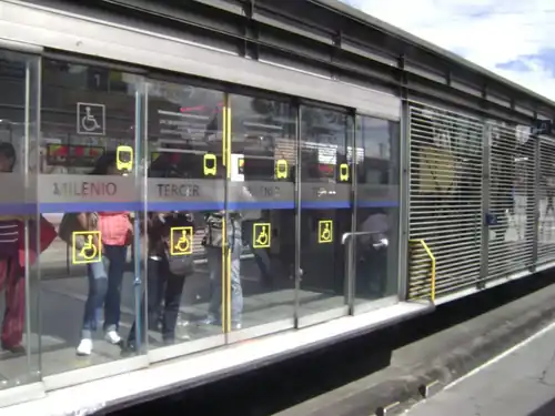 The simple-station Tercer Milenio is part of the TransMilenio mass-transit system of Bogotá, Colombia, opened in the year 2000.