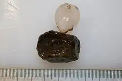 Terebratulina septentrionalis has a smooth, biconvex shell[5][6] that ranges from a yellowish to a light brown colour. The shell is composed of calcium carbonate and there is a short pedicle which acts as an anchor to hard substrates.[4] A pedicle[7] is a fleshy stalk that is able to anchor the organism to a hard substrate and allows for a short, flat shell to elongate and convex. As mentioned before, this brachiopod has a lophophore[8] which is a ciliated feeding organ used to filter plankton and other tiny organisms drifting in the current.