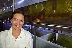 As part of the team at the K'ayra Center for Research and Conservation of Endangered Amphibians in Bolivia, Camacho Badani works for the conservation of the giant frog of Lake Titicaca, a frog threatened by pollution and illegal exploitation. With her team at MHNC, Camacho Badani has done outreach with Carrasco National Park and local schools.[8] Other species she and the K'ayra Center work with include the amphibians Rhinella justinianoi (a toad) and Nymphargus bejaranoi (Bolivian Cochran frog).[9]