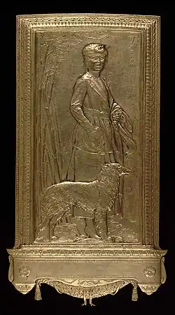 In 1921, the United States Commission of Fine Arts held a contest in order to determine who would design the new silver dollar that was to be issued as a commemorative of peace. The coin was slated to go into production later that year.[3] Eight sculptors were invited to take part. The artists invited were Chester Beach, Victor David Brenner, Anthony de Francisci, John Flanagan, Henry Hering, Hermon Atkins MacNeil and Adolph Alexander Weinman.[3] De Francisci's design was eventually chosen. As winner of the contest, de Francisci was awarded $1,500; the other seven participants were awarded $100 for their entries.[3]