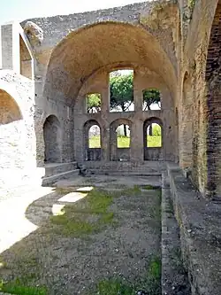 The caldarium was, unusually, divided with two rows of travertine columns resembling a basilica, with a large central hot bath and with three small bathtubs on the sides between the columns. It was fed by hot water from a sulfurous spring. Nozzles allowed excess water from the pool to flow into the bathtubs, thus keeping the water level constant. Under Hadrian the columns were replaced and strengthened by embedded half-pillars to support a coffered and vaulted roof. Underneath the vault a terrace with pavilion roof (some sort of walkway) was built. The room was decorated with beautiful marbles and Ionic capitals. At the end of the caldarium is an apse with a rectangular niche, almost completely restored, in which is a marble altar with a dedication in Greek to the Nymphs, put there by Alcibiades, a freedman of Hadrian.[15] Two shelves at its sides probably supported the small columns of a votive niche holding the simulacrum of some water deities, perhaps the water nymphs, who were believed by the Romans to be the guardian spirits of underground springs.[2]