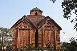 Terracotta temples is divided into four categories as per their form composition and structure style and not the construction style - Chala, Ratna, Deul and Dalan.[3][6] The temples of pre-Muslim period can be called tall curvilinear rekha deul.[7] Popularly seen hut style temples have two variations Chala and Bangla style, this style is influenced from huts of Bengal, commonly known a Bengal Roof. Chala temple consists of a sloping roof joined at curvilinear edges and ending in arched cornices, there are further variations in the style in which the number of chalas are increased or their formation is modified.[1] Do Chala style has a roof sloping on two sides with a ridge at the top, another style is Jor Bangla which is composed of twin do chala attached to each other. Further modification of do chala is char chala which is a four sided sloping roof and then ath chala which is a char chala mounted with smaller char chala.[2] Plan of these temple are generally simple, composed of a square or rectangle.
