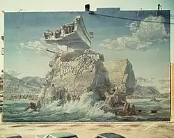 Completed in 1971, the LA Fine Arts Squad's best-known mural, Isle of California, was a 42' x 65' apocalyptic trompe-l'oeil mural depicting California in the aftermath of a major earthquake. A "crowning achievement of realist muralism,"[12] it was painted on the back wall of the Village Recorder in West Los Angeles. The Los Angeles Times reported that Isle of California, commissioned by Geordie Hormel, "caused a sensation" when it was completed. Schoonhoven and Henderson took a six-week break from Isle of California to paint Hippie Know How, a 19' x 15' mural shown during the Biennale de Paris.[13]
