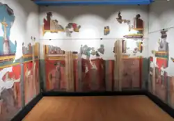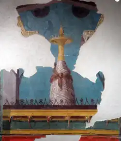 Villa 6 is remarkable for its enormous and refined Second Style frescoes from a dining room representing mythological figures including Cybele and Attis as well as Paris and Helen at various ages.[6] In its last phase an agricultural part of the complex was added focussed on a winery with a large threshing floor and a columned portico, adjacent lever press (torcularium) and dolia in a wine cellar. Outside the NE entrance to the villa skeletons of seven fugitives were found.[7]