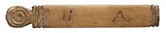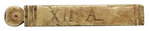 The term tessera lusoria (plural: tesserae lusoriae), is a modern archaeological name coined by Christian Hülsen in 1896, to denote a collection of tokens made of flattened bone or ivory and characterized by a parallelepiped shape.[1] Tesserae lusoriae date to the Republican period. The production process involved shaping, filing, and engraving bone from a bovine limb, resulting in moldings at the ends of the tokens.[2] Many examples of tesserae lusoriae have a rounded part decorated with concentric circles;[3] a hole was often drilled through the circular part to allow a string to be placed through the hole, tying the tokens together and allowing them to be carried as a set.[4][5]