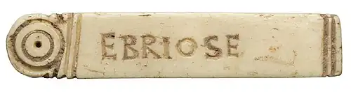 With a few exceptions, tesserae typically feature an inscription with word, often an adjective, and a numeral on the opposite side. In some examples, the numeral is sometimes accompanied by either exclusively the letter "A" or an "A" alongside a lambda.[1][5] These unique markings possibly signify a separate type of token from more standard pieces, with the lambda potentially serving as a modifier.[8] Suggestions link low-numbered tokens to derogatory expressions such as "gulo" or "piger,"[9] meaning "glutton" and "dull person" respectively, and high-numbered ones to more positive traits such as "benignus" or "felix," meaning "kind" or "lucky" respectively.[2][10][11] Certain numbers may also have correlated to specific types of negative characteristics; multiple, separate tokens inscribed with the numeral "4" all utilize words referencing the idea of gluttony. The word "gulo" appears on tokens from Gabii and Perugia, the word "ebriose" (meaning "drunk") appears on different token, and another example contains the word "vapio" (possibly related to the word "vappa," meaning flat wine or a worthless person).[12] The more profane phrases are typically written in the vocative case, while the more positive traits are typically expressed in the nominative.[12] Some tesserae lusoriae contain verbs in their inscriptions: one token reads "vix rides," meaning "you're almost laughing" or "you're finally laughing."[13] If the token is flipped word side-up along the long edge, then the number always appears on the right side.[5]