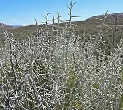 The plant forms a sprawling thicket and is very spiny. The green leaves dry and their tissues fall away, leaving the veins as hard, sharp spines. When in foliage the bush has green, hairy stems and bears yellow daisylike flowerheads in the axils, or angles, of the newest branches. The fruits are released in masses of cottony seed.
