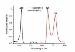 Tetraphenylporphyrin has a strong absorption band with maximum at 419 nm (so called Soret band) and four weak bands with maxima at 515, 550, 593 and 649 nm (so called Q-bands). It shows red fluorescence with maxima at 649 and 717 nm. The quantum yield is 11%.[11] Soret red shifts for Zn(TTP)-Donor systems relative to the Soret band at 416.2 nm for Zn(TTP) in cyclohexane have been measured.[9]