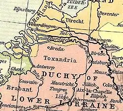 - ^ Bijsterveld & Toorians 2018, p. 41: "It was only later that antiquarians started to use Texandria again or, more often, the later variants Taxandria or Toxandria, to denote Kempenland or the Kempen region, which today straddles the Dutch-Belgian border."