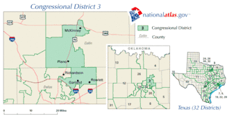Texas's 3rd congressional district is a United States House of Representatives district in suburban and some rural areas north and northeast of Dallas. It encompasses much of Collin County, namely McKinney and Allen, as well as parts of Plano, Frisco, and Prosper. Additionally, the district includes all but the southern portion of Hunt County. The district is also home to a public four-year university, Texas A&M University-Commerce, as well as most of the Collin College campuses.