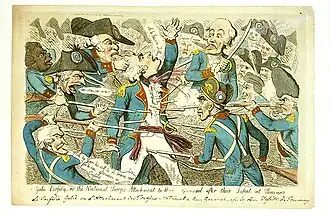 On 29 April 1792, following the loss of a skirmish with Austrian forces, Dillon was murdered by his own men outside the city of Lille. The troops apparently believed that their defeat by the Austrians was the result of a conspiracy on the part of Dillon, whom they called a "traitor and aristocrat".[1]