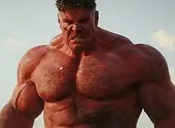 While the VFX for Banner's green Hulk was based on apes and gorillas, Ford's Red Hulk was based on a bear, with Onah stating that they wanted Red Hulk "to have a slightly different posture" and a "different way he held his chest out".[44] Wētā FX brought in a bodybuilder as reference to see how Red Hulk's muscles would move.[51] They also utilised their "Loki state machine" to model a new high-resolution muscle set, and to help show "bones breaking, reforming, driving under the skin, vein detail, and clothes ripping and disintegrating".[44] Onah noted that a key inspiration for Red Hulk's transformation was An American Werewolf in London (1981).[44]
