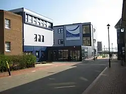 In 2017, Thurrock Council approved four free school applications made to combat Thurrock's rapidly growing population. These included the Orsett Heath Academy, Treetops Free School and Thames Park Secondary School. Thames Park's creation was to be overseen by the Osborne Co-operative Academy Trust, providing Thurrock places for another 900 students.[11] The school would design its logo and brand with the help of design agency Periscope. The logo's four elements would represent ripples in the River Thames and local parks, green belt areas, industry and agriculture.[13] In 2019, the Department for Education began funding the construction of the school, which would be located adjacent to Palmer's College. Originally the school was planned to be built on Elm Road but these plans were dropped. In the meantime, the school would temporarily be housed in a building previously used by South Essex College's Grays campus.[14][15] In August 2020, the Department for Education appointed development company Bowmer and Kirkland to construct the school's permanent site and plans were drafted. The plans prioritised the school's specialism in digital technology and were praised as being "state-of-the-art" by the school's first headteacher, Kam Bains.[9]