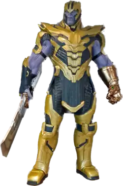The character's stage name is a reference to the Marvel Comics character of the same name,[2] featuring purple hair similar to Thanos' skin color and fingernails painted to resemble the Infinity Stones from Marvel that Thanos uses.[4] Creator Hwang Dong-hyuk stated that he was named Thanos to give the character more worldwide appeal.[5] He speaks Korean, but occasionally speaks English, something found in certain Korean music genres. In the English dub of the show, the voice actor for Thanos only speaks English.[6] Gizmodo writers Germain Lussier and Cheryl Eddy considered him one of the highlights of the season and its best villain, considering him "hilarious and charming." They compared him to Thanos from Marvel, believing that him being "dumb" contrasted with Marvel's Thanos' intelligence, feeling that the rapper Thanos "doesn't quite grasp his own persona."[7]
