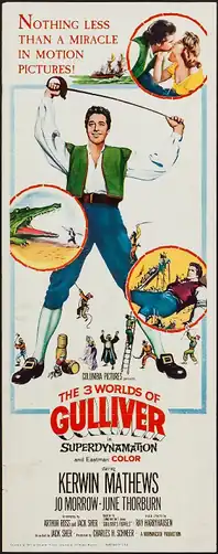 The 3 Worlds of Gulliver is a 1960 American Eastmancolor fantasy adventure film loosely based upon the 1726 novel Gulliver's Travels by Jonathan Swift. The film stars Kerwin Mathews as the title character, June Thorburn as his fiancée Elizabeth, and child actress Sherry Alberoni as Glumdalclitch.