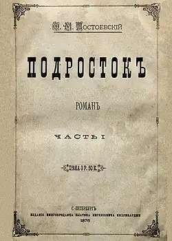 The Adolescent (Russian: Подросток, romanizedPodrostok), also translated as A Raw Youth or An Accidental Family, is a novel by Russian writer Fyodor Dostoevsky, first published in monthly installments in 1875 in the Russian literary magazine Otechestvennye Zapiski.[1] Originally, Dostoevsky had created the work under the title Discord.