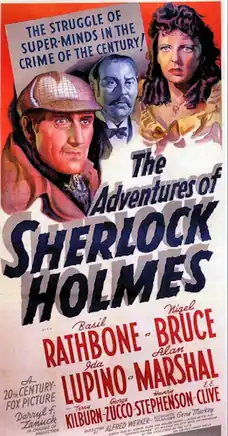 The Adventures of Sherlock Holmes (released theatrically as Sherlock Holmes in the United Kingdom) is a 1939 American mystery adventure film[2] based on Sir Arthur Conan Doyle's Sherlock Holmes detective stories. Although claiming to be an adaptation of the 1899 play Sherlock Holmes by William Gillette, the film bears little resemblance to the play.[3]