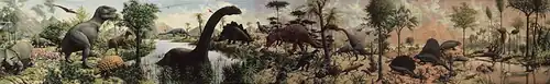 The Age of Reptiles is a 110-foot (34 m) mural depicting the period of ancient history when reptiles were the dominant creatures on the earth, painted by Rudolph Zallinger. The fresco sits in the Yale Peabody Museum in New Haven, Connecticut, and was completed in 1947 after five years of work.[1] The Age of Reptiles was at one time the largest painting in the world, and depicts a span of nearly 350 million years in Earth's history.
