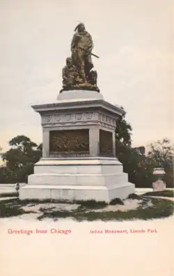 The Alarm (Indian Alarm) is a Bronze statue by John J. Boyle located in Lincoln Park, Chicago. Commissioned in 1880, and dedicated on May 17, 1884, it shows a Native-American couple with infant and pet dog, looking with concern into the distance.[1] On the base are four incised granite tablets (originally bronze reliefs) with scenes of Ottawa life: "The Peace Pipe," "The Corn Dance," "Forestry," and "The Hunt."