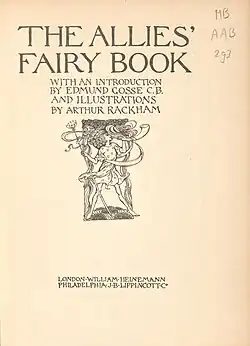 The Allies' Fairy Book is a compilation of fairy tales published by William Heinemann and J.B. Lippincott in 1916. Illustrated by Arthur Rackham, the volume includes an introduction by Edmund Gosse.[1] The children's book contains a selection of fourteen tales from 11 allied nations in the First World War. The countries England, Wales, Scotland, Ireland, France, Italy, Portugal, Russia, Serbia, and Belgium are all represented by one tale each, while Japan has three shorter fairy tales.[2] Some allied forces are not represented as they joined after the time of publication.[3] The book also contains 11 full-page color illustrations as well as smaller monotone illustrations created by Arthur Rackham.[1]