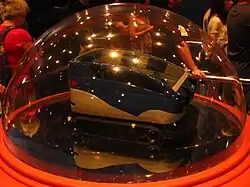 The ride vehicles, co-developed by Oceaneering International, are mounted to a track-roaming platform that provides the forward motion to move the vehicle through each show scene.[20][23] The yaw motor and attached stewart platform allow them to move 360 degrees at different angles along the track.[24] The track switches were manufactured by Dynamic Structures.[25] Each of the vehicles designed by Thierry Coup are themed as the Daily Bugle's new "Scoop" vehicle for reporters, with each accommodating 12 riders.[26] Each row of four riders is restrained by a single lap bar.[5] The system was invented by Universal Creative employees Philip Hettema, William Mason, and Gary Goddard.[27] A similar system has been patented by Oceaneering International and used on rides such as The Curse of DarKastle at Busch Gardens Williamsburg, Tokyo Panic Cruise at Tokyo Dome, and Speed of Magic at Ferrari World Abu Dhabi.[28][29][30]