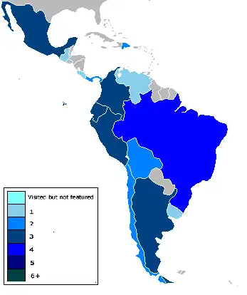 As of the sixth season, the Latin American version of The Amazing Race has visited 15 countries and has visited only the Americas (except Canada and the United States).