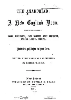 The Anarchiad (1786–87) is an American mock-epic poem that reflected Federalist concerns during the formation of the United States. The Anarchiad, or American Antiquities: A Poem on the Restoration of Chaos and Substantial Night was penned by four members of the Hartford Wits: David Humphreys, John Trumbull, Joel Barlow, and Lemuel Hopkins. It was serialized in 12 parts in The New Haven Gazette and Connecticut Magazine between October 26, 1786 and September 13, 1787.[1]