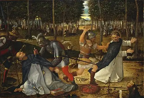 The Assassination of Saint Peter Martyr is an oil-and-tempera painting on wood executed ca. 1507 by the Italian Renaissance master Giovanni Bellini. The painting measures 67 by 100 cm and is now in the National Gallery, London.[1] A workshop version of around 1509 is now in the Courtauld Gallery.[2] Both paintings show the murder of Saint Peter Martyr.