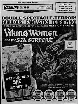 Drive-in advertisement from 1958 for The Astounding She-Monster and co-feature, The Viking Women and the Sea Serpent.