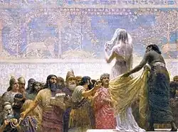 The Babylonian Marriage Market is an 1875 painting by the British painter Edwin Long. It depicts a scene from Herodotus' Histories of young women being auctioned into marriage in the area then known as Babylon or Assyria. It received attention for its provocative depiction of women. Long's use of historical detail to make the painting engaging yet relatable has been highly regarded.[1] The work was purchased by Thomas Holloway in 1882 and is owned by Royal Holloway, University of London.
