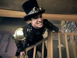 The League of STEAM's full ensemble cast appear in key roles in the video.[27] They also brought in additional cast members to further populate the scene and create a richer atmosphere with a unified aesthetic. With a newcomer by the name of Misty Rose acting as the betrothed of the deceased in which the wake is for. In addition, The League's Creative Director Nick Baumann acted as the production’s primary steampunk consultant. On the set for the video, shot in Newhall, California, in January 2011, nods to Panic! at the Disco's past were present, from a clock on the wall (the main one set to nine o'clock, in honor of their "Nine in the Afternoon" video) to the dusty top hat resting on a church pew and the closing of the church's door (recalling "I Write Sins Not Tragedies").[27] Urie plays two separate characters, one "inspired by Sweeney Todd and very Johnny Depp," which Urie insists "was all [Shane Drake]'s direction."[27] The ranch at which the video was shot was once the set for the HBO series Deadwood.[28]