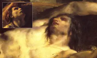Delacroix's pupil and chief assistant of over a decade, Pierre Andrieu, recorded that Delacroix had told him the inspiration for these drops had come in part from the water drops visible on the nereids in Rubens' The Landing of Marie de' Medici at Marseilles, and that the drops on The Barque of Dante were Delacroix's point of departure as a colourist.[7] Lee Johnson discussing these drops comments that "the analytical principle [Delacroix] applies of dividing into pure coloured components an object that to the average eye would appear monochrome or colourless, is of far-reaching significance for the future."[8]