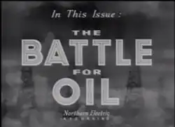 Typical of the NFB's Canada Carries On series of documentary short films, The Battle for Oil was a morale-boosting propaganda film made in cooperation with the Director of Public Information, Herbert Lash.[2] Using the format of a compilation documentary, the film, edited by Stuart Legg to provide a coherent story, relied heavily on newsreel material including "enemy" footage, in order to provide the background to the dialogue.[Note 2] A NFB film crew was also dispatched to the Turner Valley oilfields in Canada.[3]