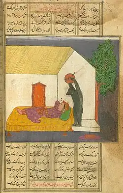 Because of the fable's existence in Eastern sources, it has been a particularly popular subject in Muslim miniatures from the East. Most often they depict the bear with the stone raised in its paws, as in the manuscript copy of the Masnavi dating from 1663 in the Walters Art Museum (see above), and another illustration from Persia dating from a little later.[13] A watercolour in Lucknow style, painted by Sital Das round about 1780 and now in the British Library, shows the bear contemplating the gardener after it has killed him.[14] Yet another Indian miniature of the fable was among those commissioned from the Punjabi artist Imam Bakhsh Lahori in 1837 by a French enthusiast of fables. Now in the Musée Jean de la Fontaine, it shows the bear in an ornamental garden.[15]