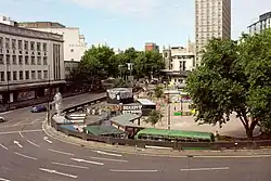 The St James Barton roundabout, colloquially known as the Bearpit, is a grade-separated roundabout and sunken pedestrian area in the city centre of Bristol, England.[1] Completed in 1968 as part of Bristol’s post-war road development scheme,[2] it carries the north-south A38 and the east-west A4044 while pedestrians and cyclists circulate one storey below in a circular concourse whose form inspired the nickname.