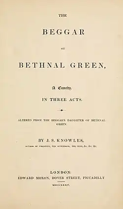 The Beggar's Daughter of Bethnal Green is a five-act comedy play by the Irish writer James Sheridan Knowles. It was first staged at the Theatre Royal, Drury Lane in 1828 in London. It takes its name from a traditional popular song of the same name. On its opening night the audience began heckling in the second act, and by the third act, their dissatisfaction had become so tumultuous that the stage manager "implored a patient hearing, pledging himself that if the opinion of the audience was so decidedly against the piece at its conclusion, it should be withdrawn".[1] The play was harshly criticised by the press for its weakness, lack of action, thinly sketched characters and lack of originality.[2] In 1834 a revised version entitled The Beggar of Bethnal Green was staged at the Victoria Theatre.[3] The action takes place in London and Romford, then in Essex.